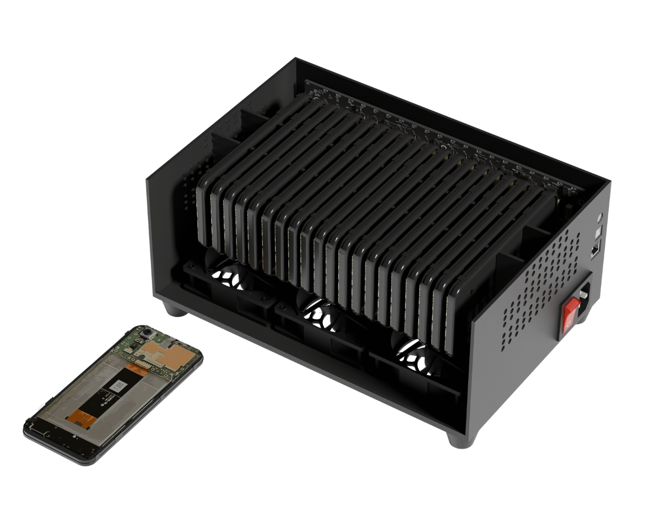 A Cellhasher is a custom chassis, often refered to as a "phone farm box", that allows managing many smartphones efficiently at scale.