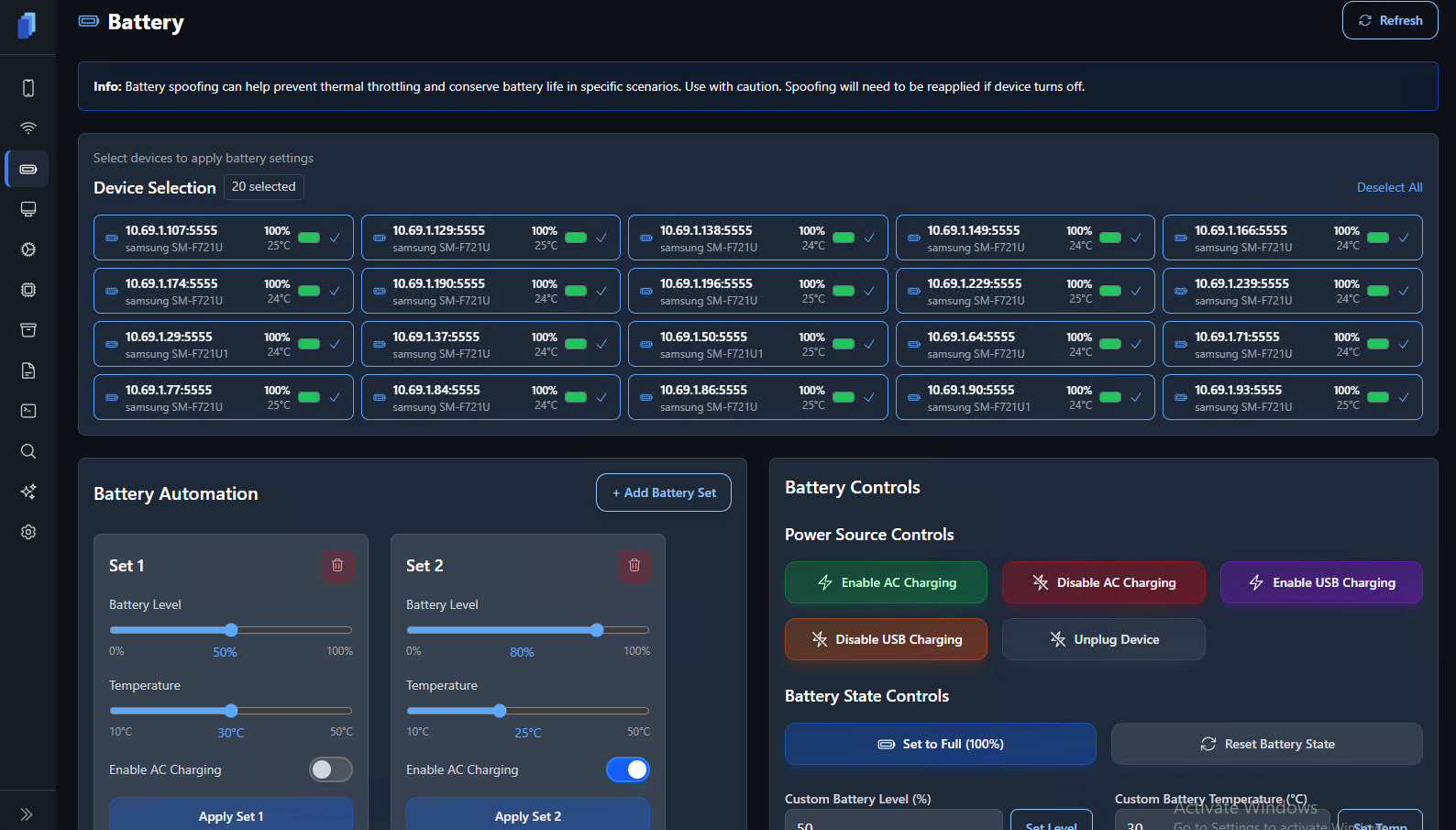 - Click the set’s Apply button — the selected devices will receive the spoofed battery values.