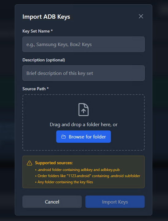 ✅ Cellhasher purcahses with phones pre-installed come with ADB Authoization Keys. Import the key files here.
