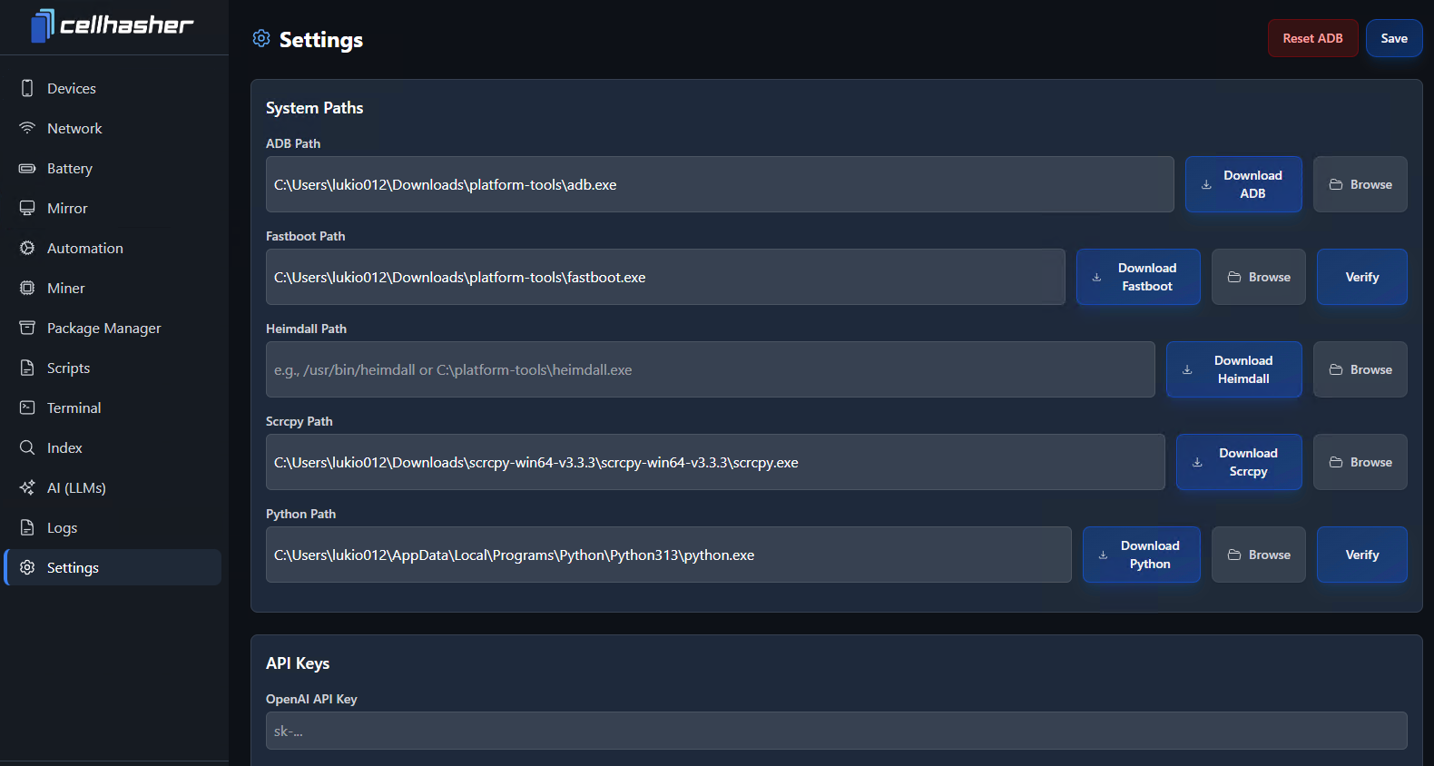 Before using most features in Cellhasher Control, your system paths must be set correctly. These paths tell the software where to find required executables like ADB, Fastboot, and Scrcpy.