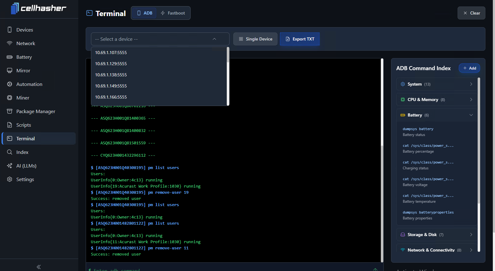 Use the Export TXT button to save terminal output logs for analysis, troubleshooting, or documentation.\ This makes it easy to keep records of operations across multiple devices.