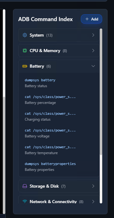 On the right side panel, you’ll find the ADB Command Index, a categorized list of helpful commands.\ You can expand sections such as: